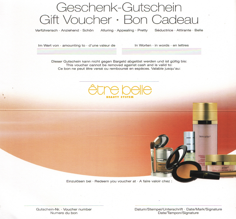 Gutschein... eine Auswahl unterschiedlicher Anwendungen Verschenken Sie mit einem Gutschein etwas ganz Besonderes zur Hochzeit, zum Geburtstag, zur Verlobung, zu Weihnachten, zu Ostern zum Muttertag oder natürlich zum Vatertag, denn wir bieten auch viele Anwendungen für den anspruchsvollen Herren! |
